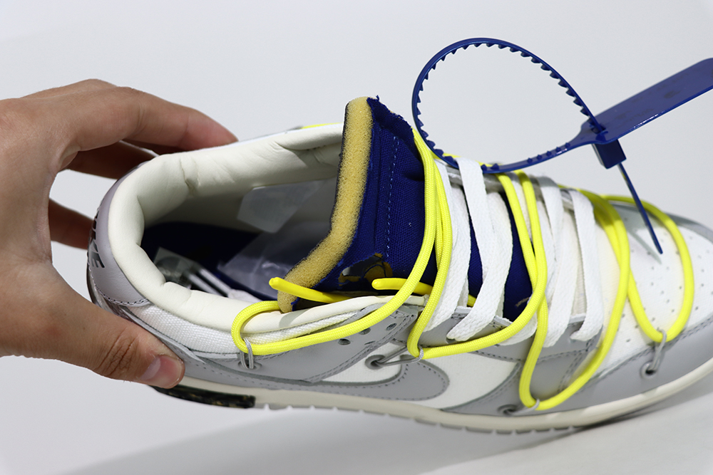 The Dunk Low Off-White Lot 27 features a textured leather upper and multiple Off-White trademarks, including the Off-White label that is on one side. The shoe comes in a Sail and Neutral Grey colorway, with the Nike Swoosh on both sides. The outsole is made of rubber and includes a lug and circular tread pattern. The heel includes Nike branding, which is also visible on the base of the sole. The shoe has a round toe cap that includes perforations. The low-cut design is completed with flat white laces. Moreover, the lacing system includes round laces that are looped through plastic eyelets.
