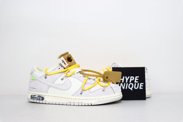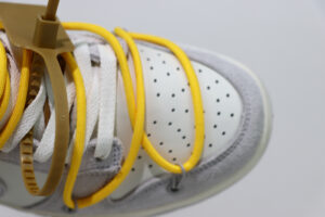 The Lot 39 Nike Dunk Low Off White sneakers start with a base leather upper covered by soft suede overlays on the ankle and toebox. The Swoosh also adopts suede construction. A green rectangular tab affixed to the swoosh adds contrast, while Virgil Abloh’s plastic zip tie has Helvetica text imprinted for more detailing. A bungee lacing system secures the sneaker around your foot while it sports yellow hues for more color blocking. A neutral grey outsole mates with an off-white midsole to complete the sneaker’s design.