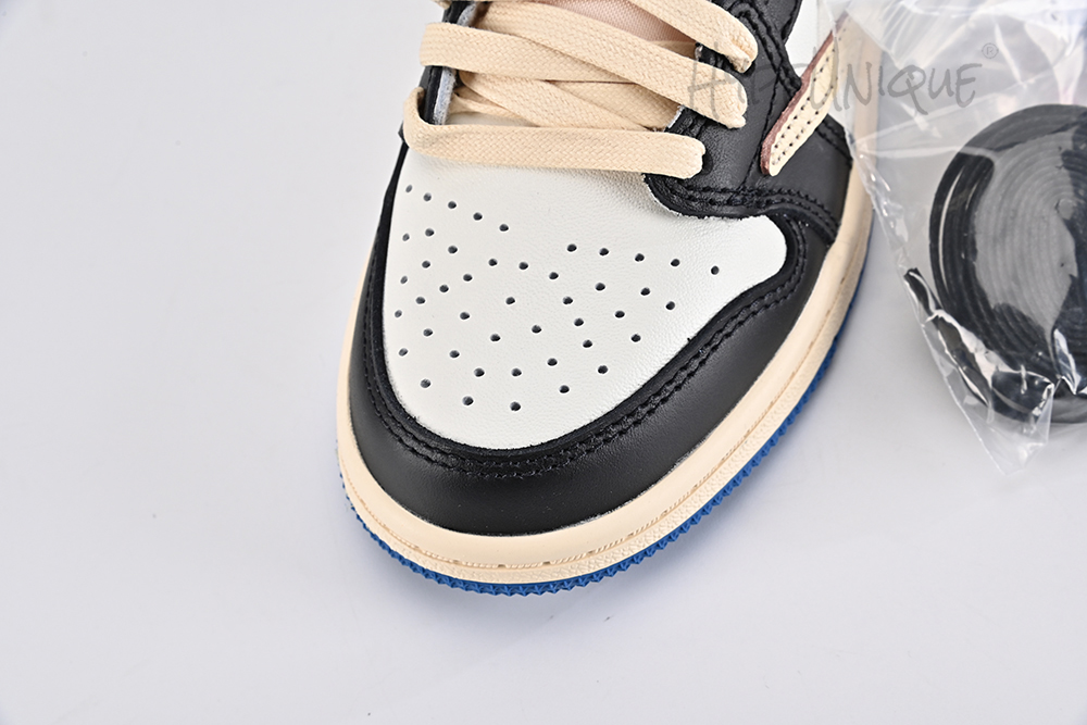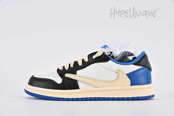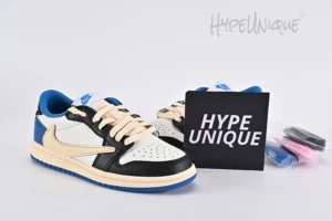 The Travis Scott Fragment Design Jordan 1s Low, a collaboration between rapper Travis Scott and Fragment Design, released in July 2021. These sneakers feature a unique colorway with a blend of white, black, and blue leather. They stand out with Scott’s signature reverse Swoosh on the lateral side, and the classic Fragment logo embossed at the heel. The design is completed with a co-branded tongue label and a pre-aged, sail-colored midsole, merging iconic style with contemporary streetwear flair.